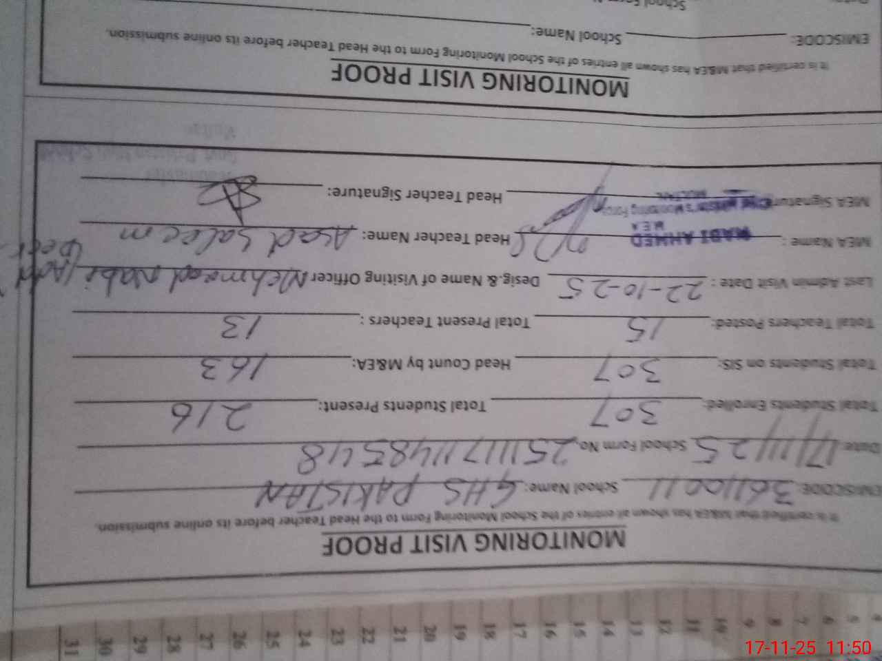 | Attendance Register | Head Teacher | MEA with School | Visit Proof |