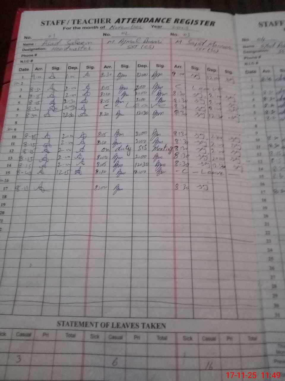| CNIC | Full Name | Designation | R/C | Absence During Last Calender Month |