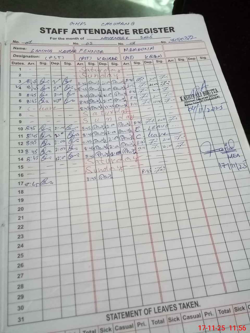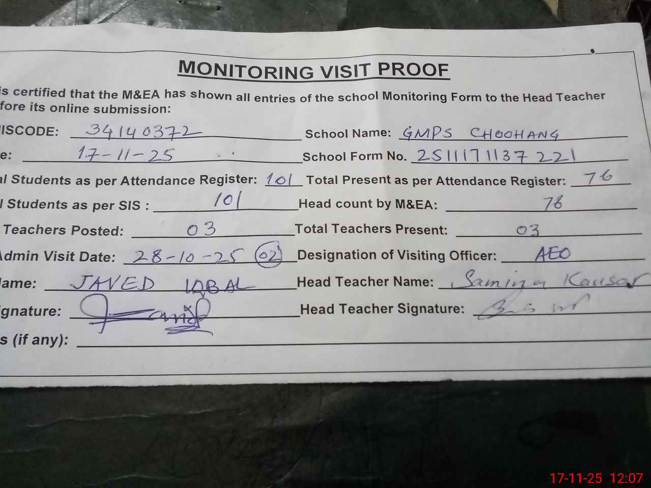 | Attendance Register | Head Teacher | MEA with School | Visit Proof |