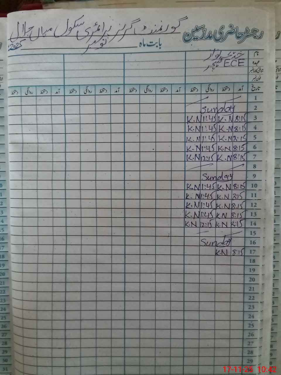 | CNIC | Full Name | Designation | R/C | Absence During Last Calender Month |