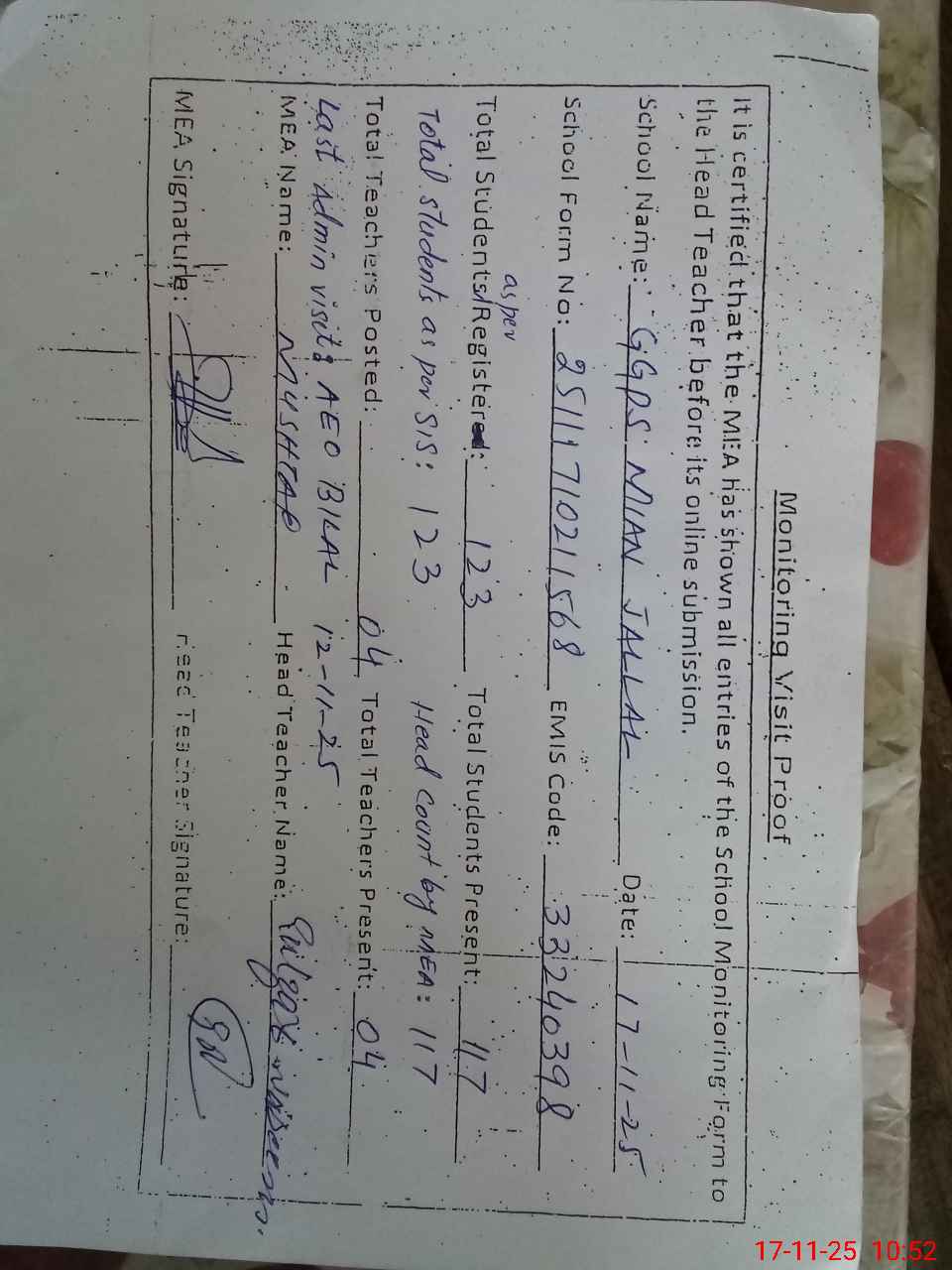 | Attendance Register | Head Teacher | MEA with School | Visit Proof |