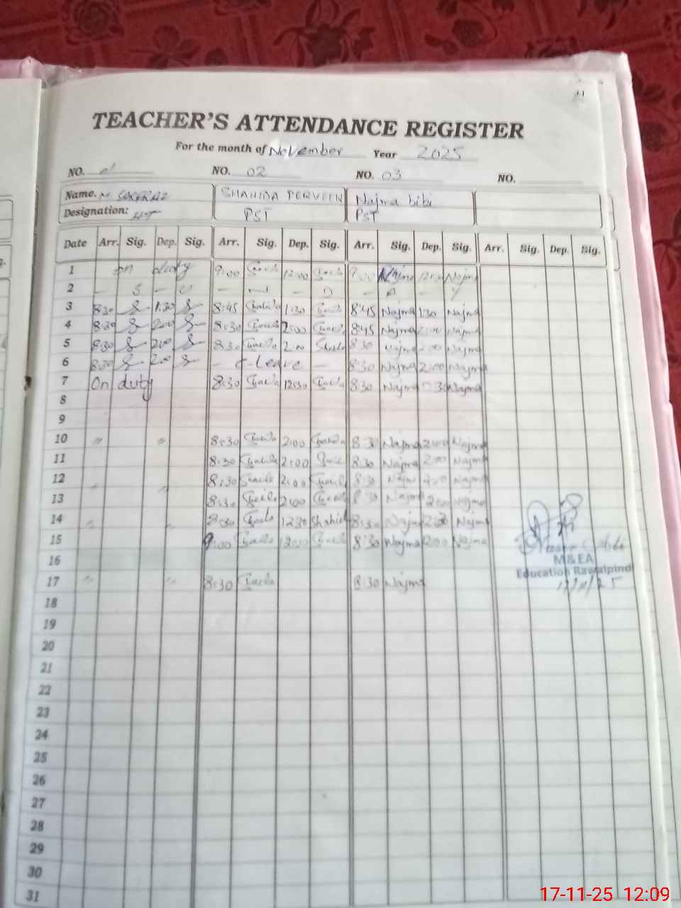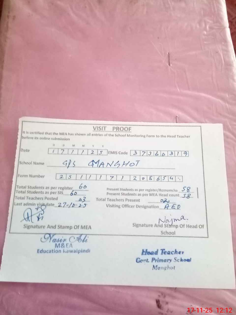 | Attendance Register | Head Teacher | MEA with School | Visit Proof |