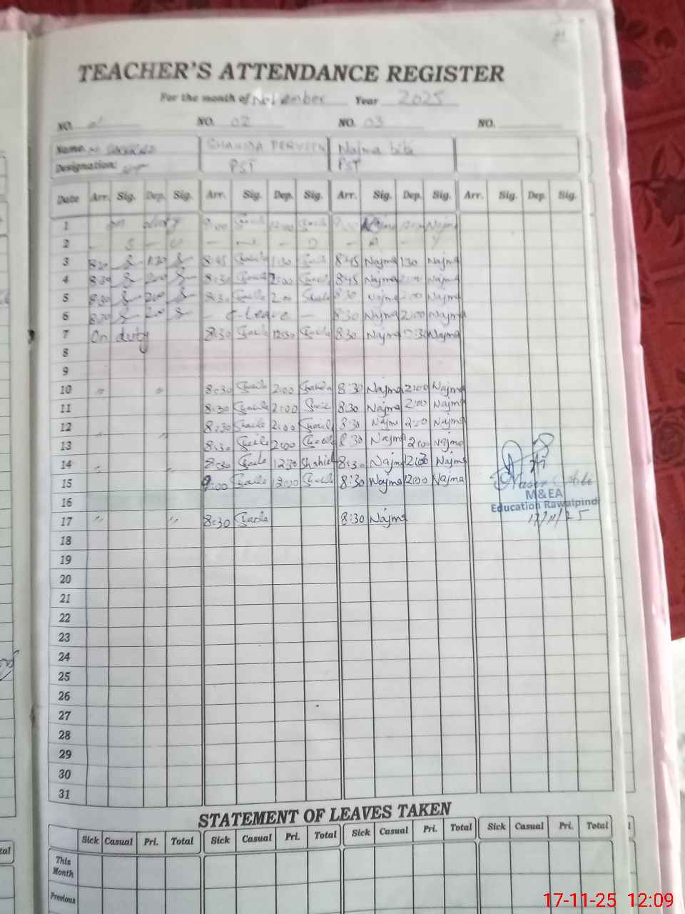 | CNIC | Full Name | Designation | R/C | Absence During Last Calender Month |