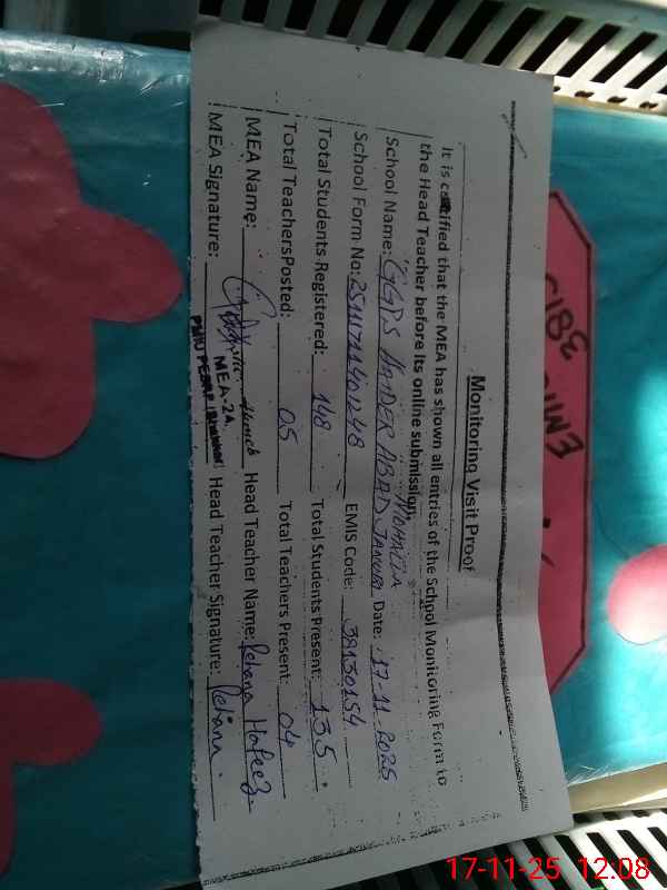 | EMIS Code: 38130154 | Name of School: GGPS HAIDER ABAD MOHALLA JANUBI | |||