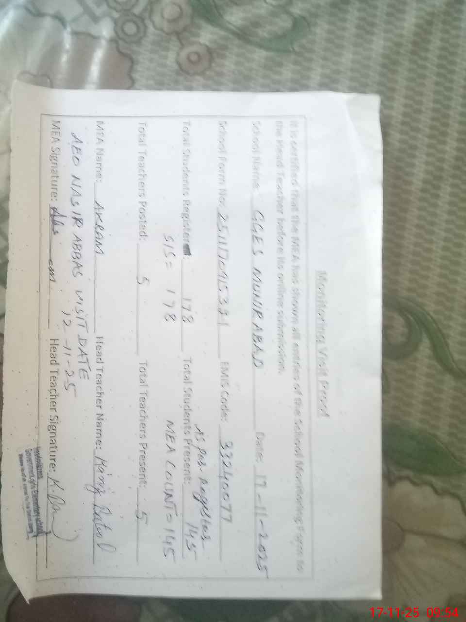 | Attendance Register | Head Teacher | MEA with School | Visit Proof |