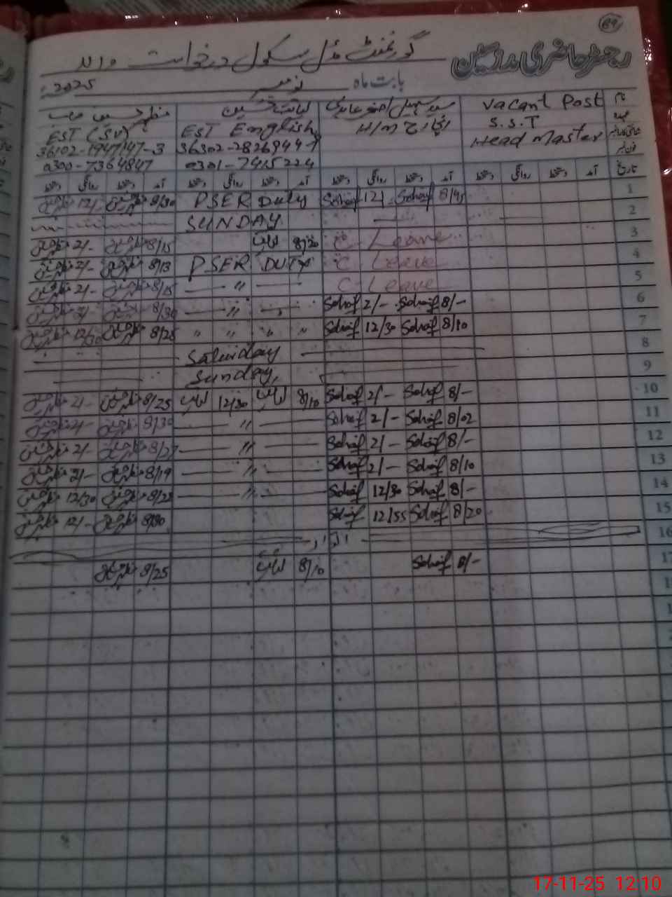 | CNIC | Full Name | Designation | R/C | Absence During Last Calender Month |
