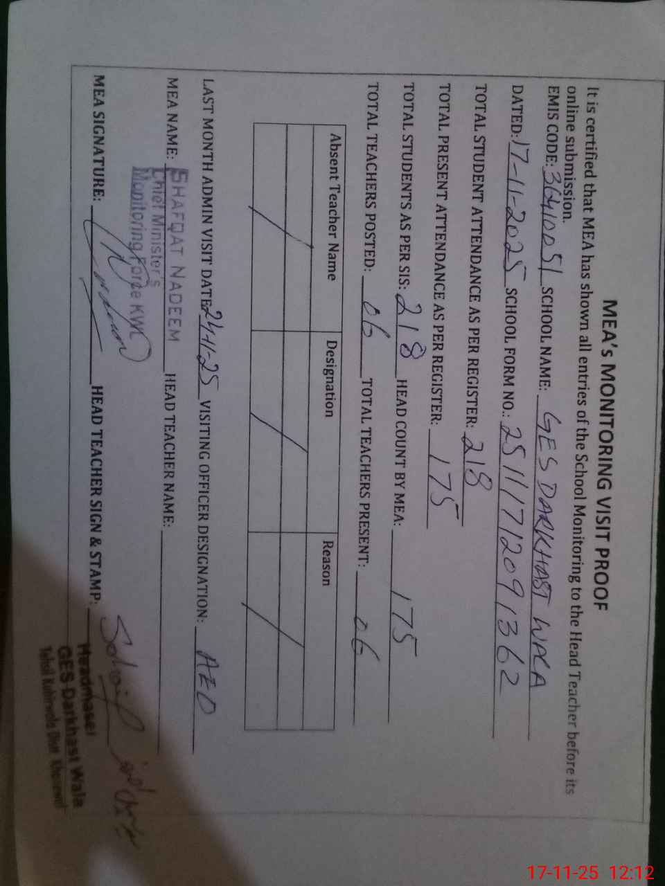 | Attendance Register | Head Teacher | MEA with School | Visit Proof |
