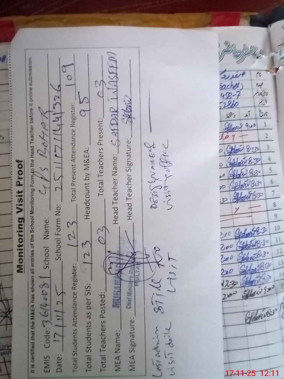 | Attendance Register | Head Teacher | MEA with School | Visit Proof |