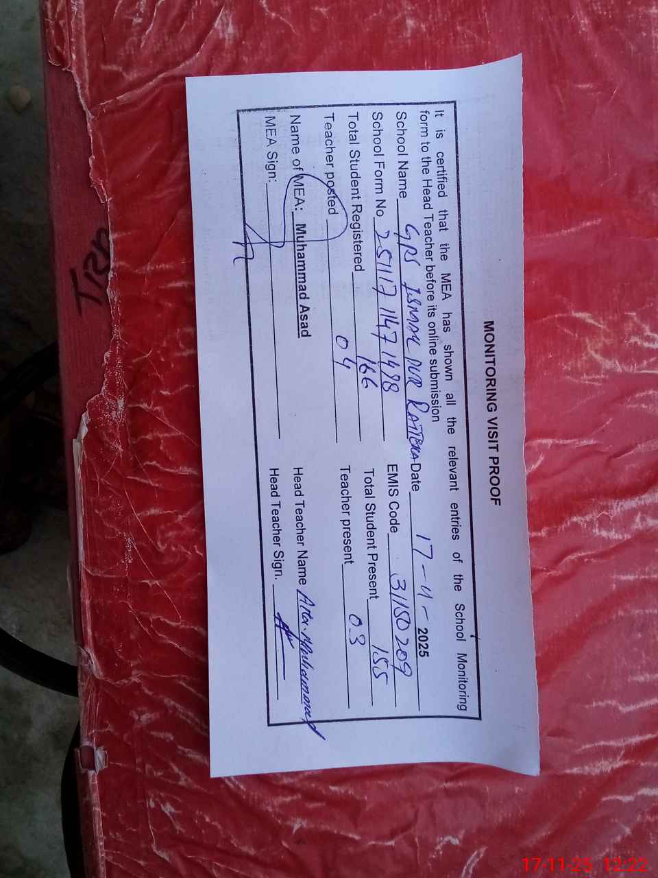 | EMIS Code: 31150209 | Name of School: GPS ISMAEEL PUR RATTIKA | |||