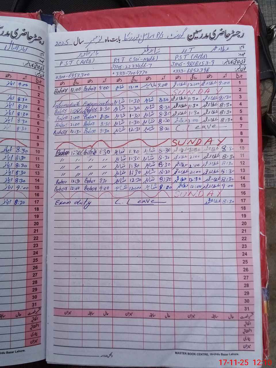 | 31**** | Ba**** Ja**** | ESE Arts | Regular | 0 | 0 | 0 | 0 | 0 | 0 | 0 | 0 | 0 | Exam Duty |
