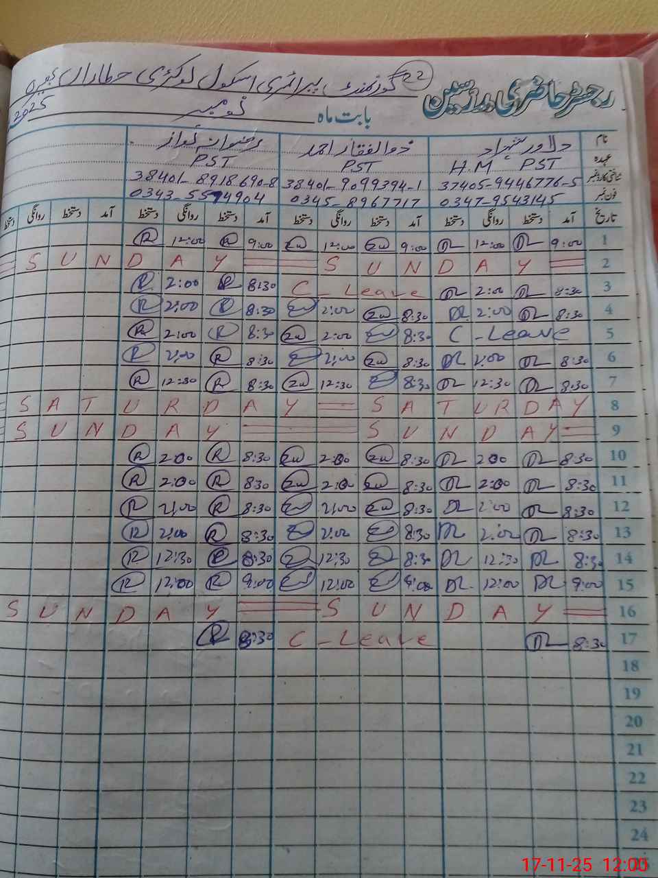 | CNIC | Full Name | Designation | R/C | Absence During Last Calender Month |