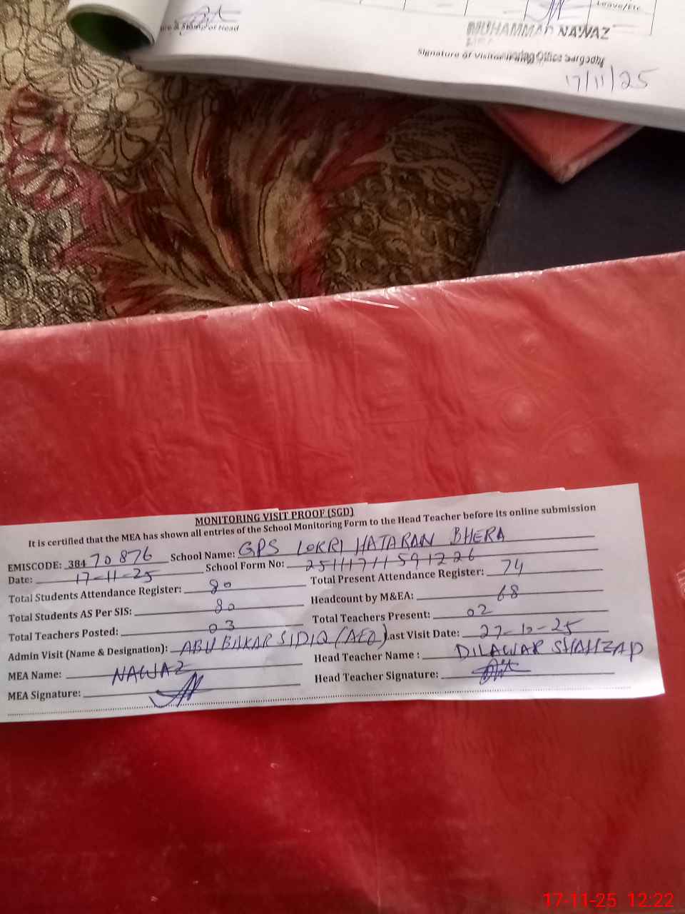 | Attendance Register | Head Teacher | MEA with School | Visit Proof |