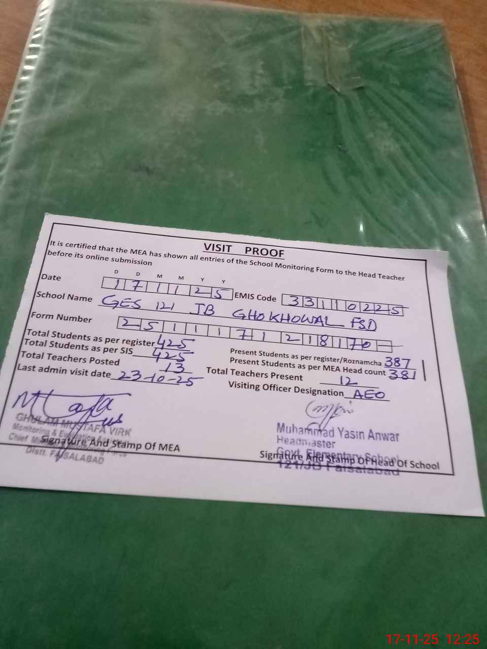 | EMIS Code: 33110225 | Name of School: GES 121 JB GHOKHUWAL FSD | |||