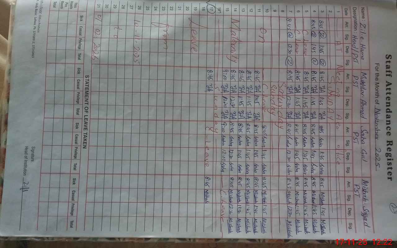 | CNIC | Full Name | Designation | R/C | Absence During Last Calender Month |