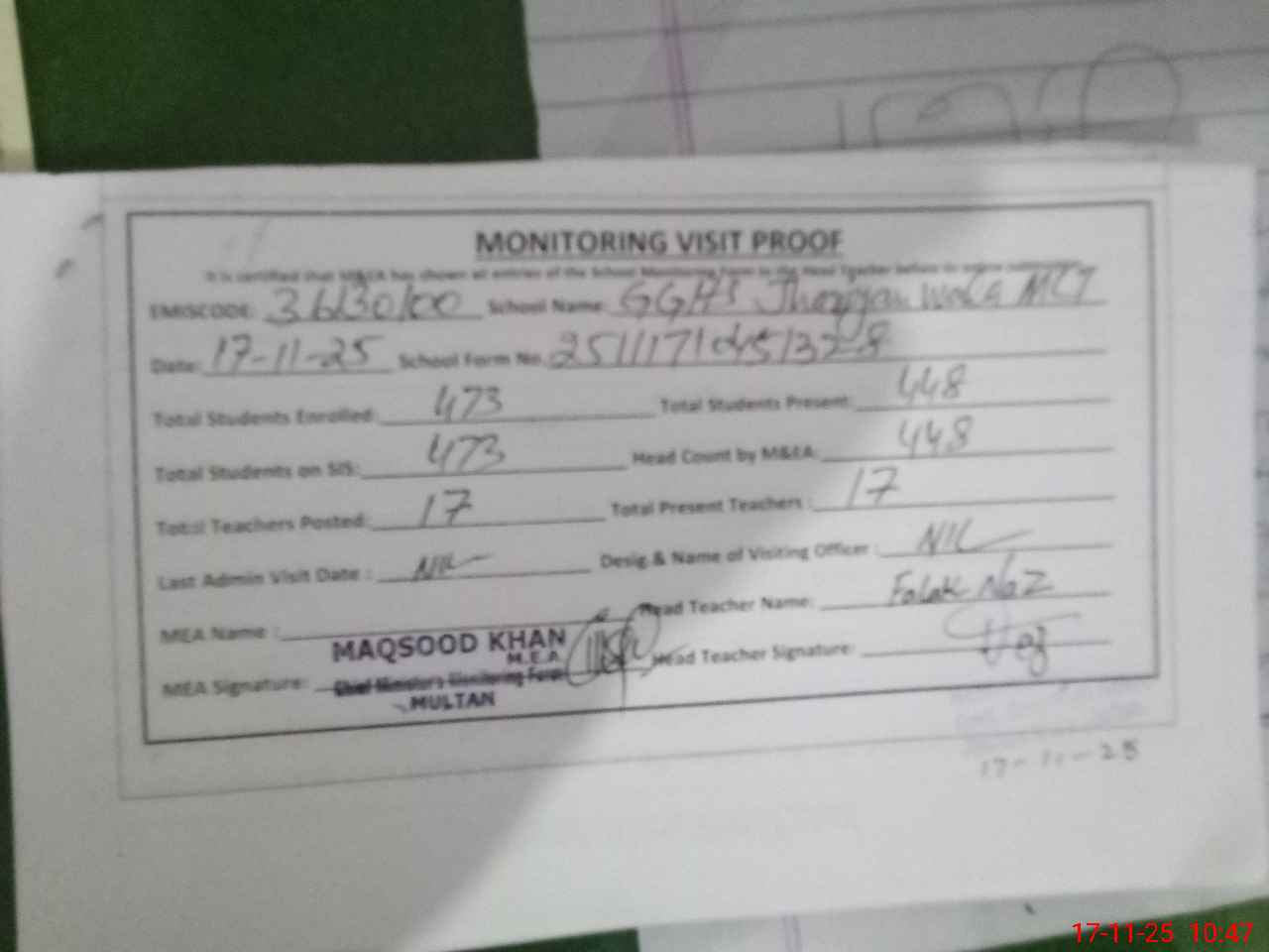 | Monitoring Date: 17-11-2025 | Start Time: 17-11-2025 10:23 AM | End Time: 17-11-2025 10:48 AM | Name of MEA: MA**** ULHA**** KH**** | |