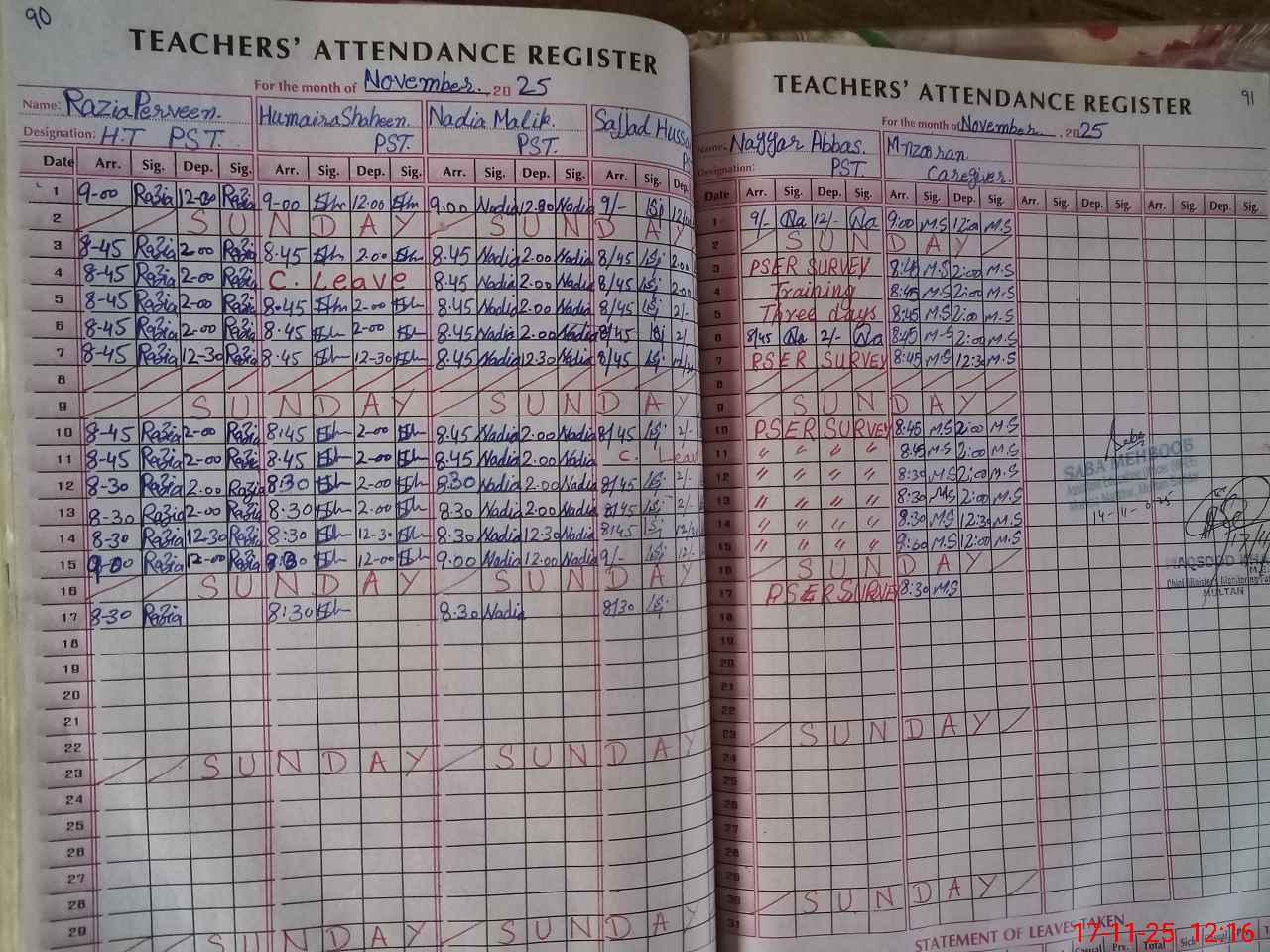 | CNIC | Full Name | Designation | R/C | Absence During Last Calender Month |