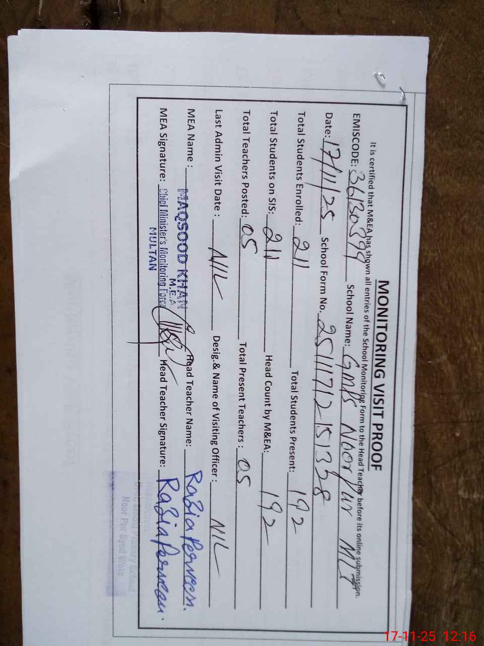 | Attendance Register | Head Teacher | MEA with School | Visit Proof |