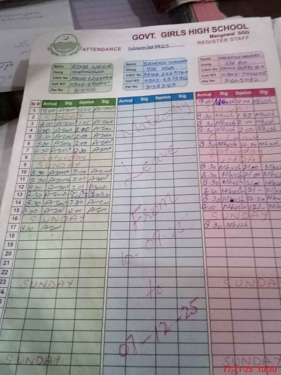 | CNIC | Full Name | Designation | R/C | Absence During Last Calender Month |