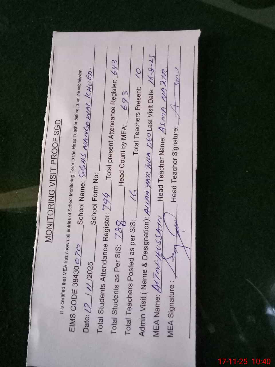 | Attendance Register | Head Teacher | MEA with School | Visit Proof |