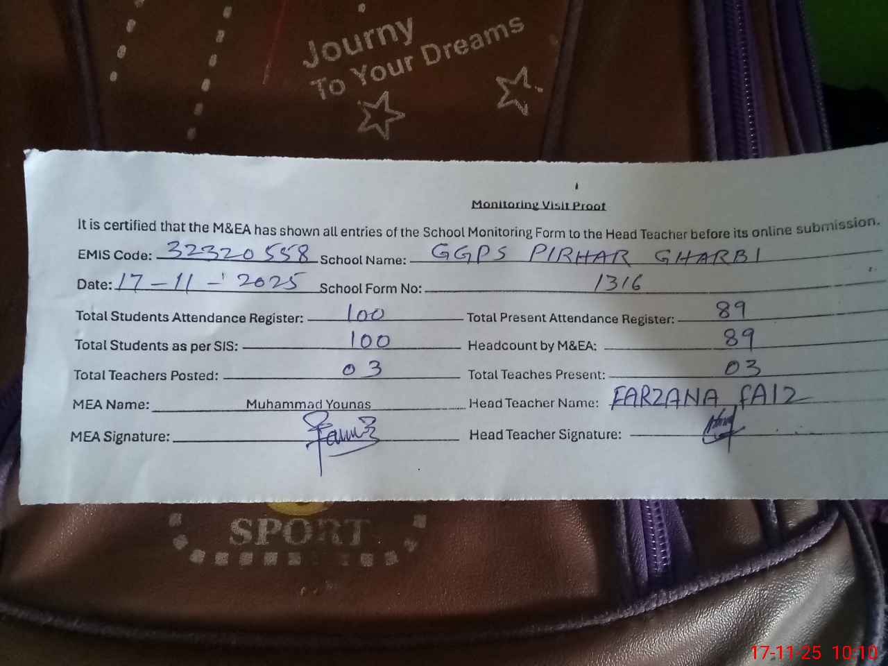 | Attendance Register | Head Teacher | MEA with School | Visit Proof |