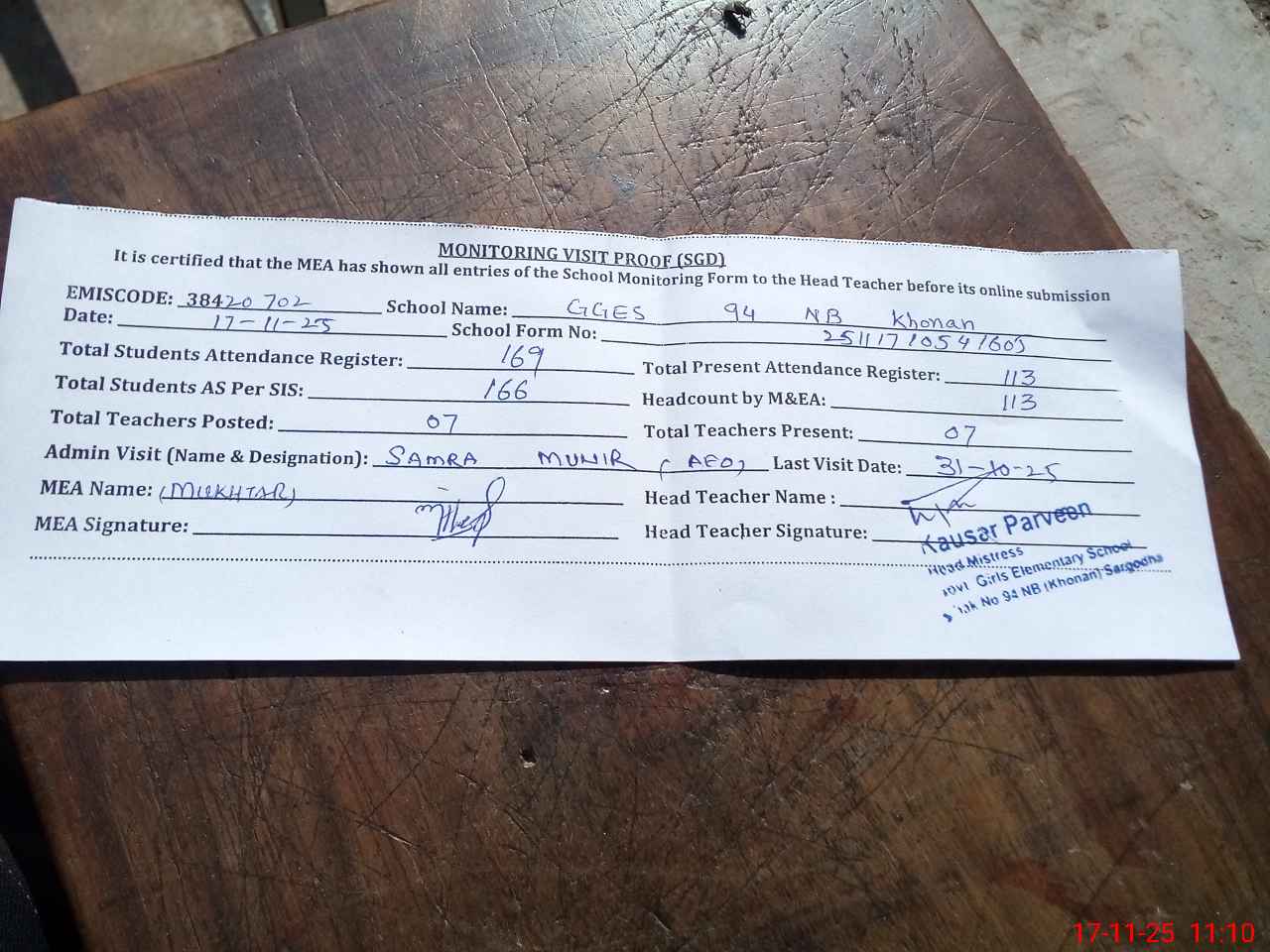 | Attendance Register | Head Teacher | MEA with School | Visit Proof |