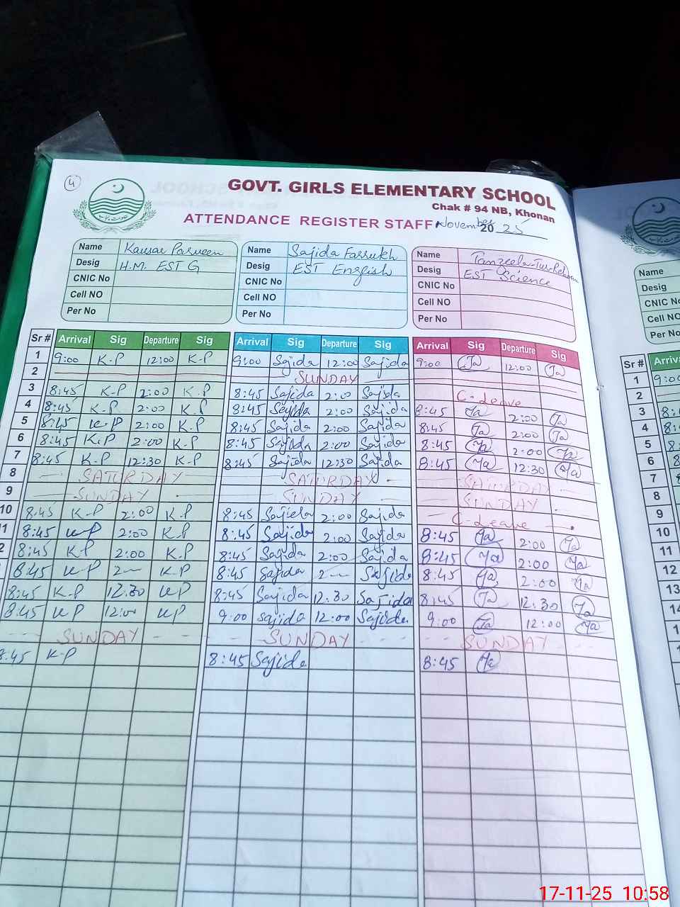 | CNIC | Full Name | Designation | R/C | Absence During Last Calender Month |
