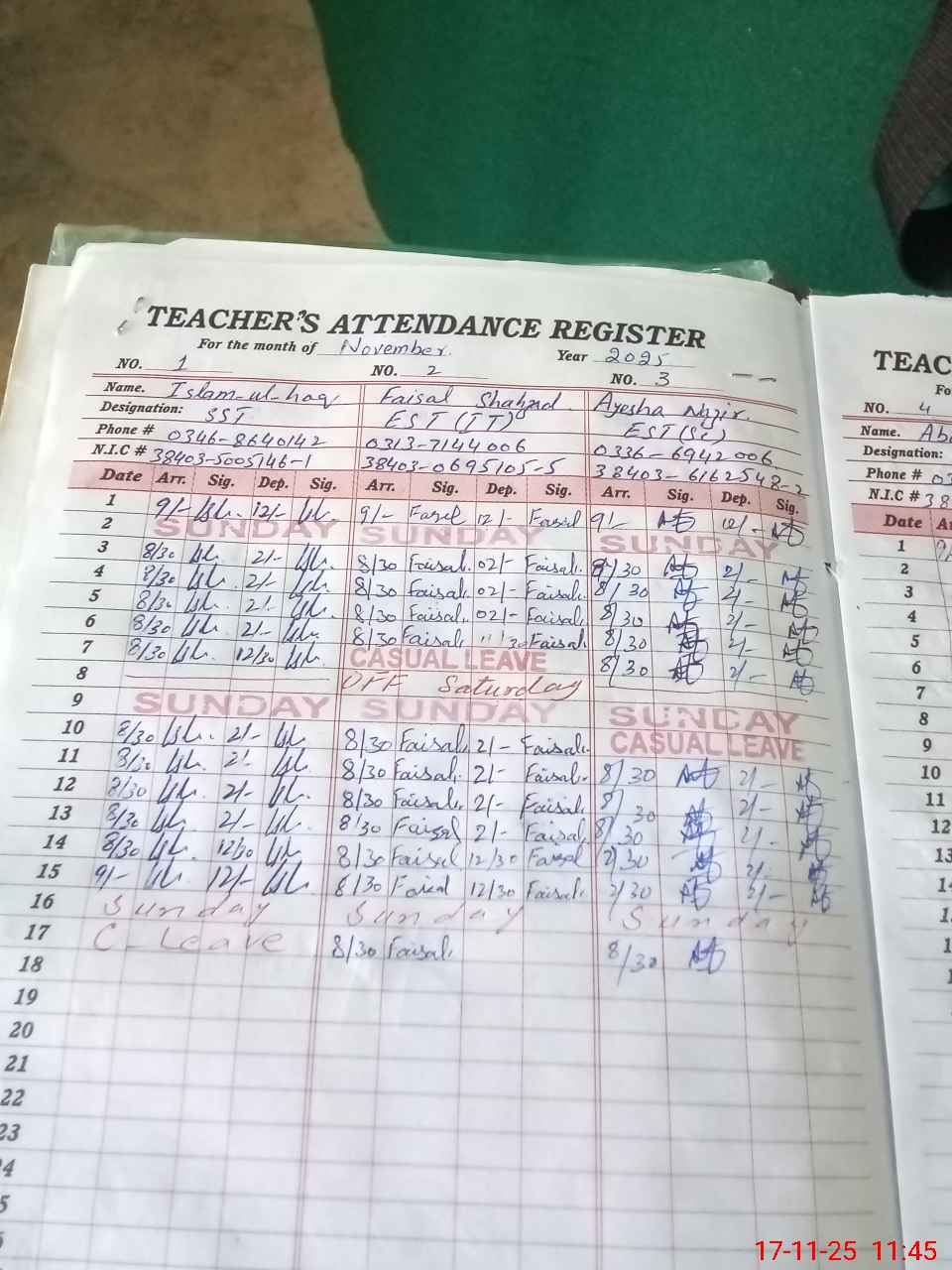| CNIC | Full Name | Designation | R/C | Absence During Last Calender Month |