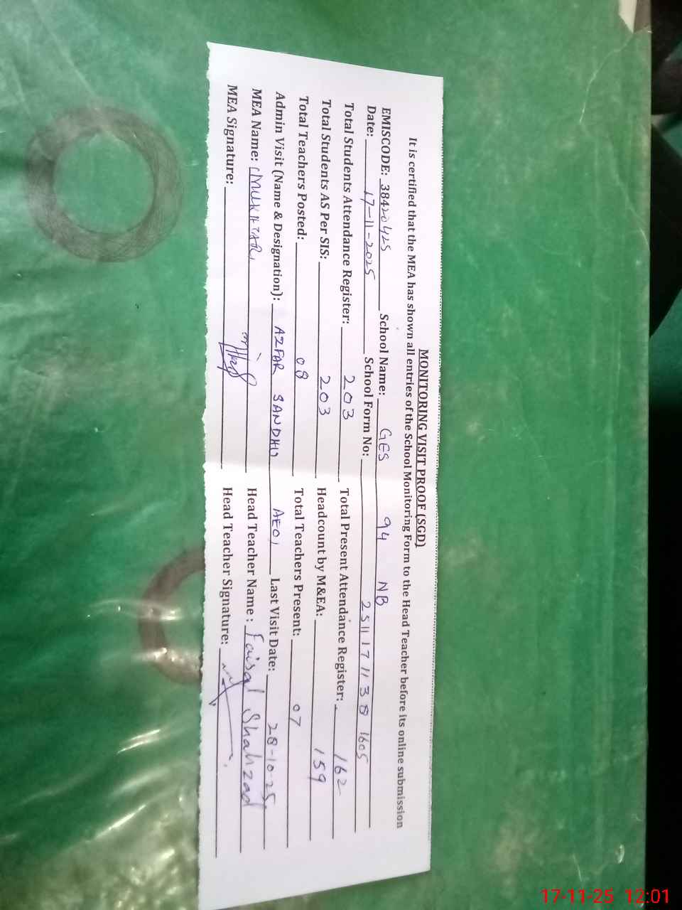 | Attendance Register | Head Teacher | MEA with School | Visit Proof |
