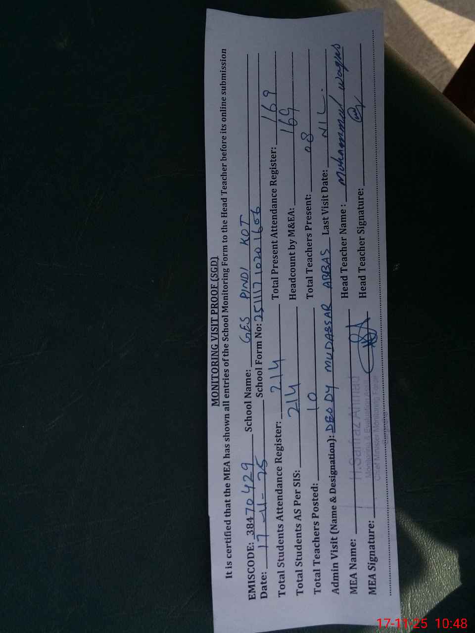 | Attendance Register | Head Teacher | MEA with School | Visit Proof |