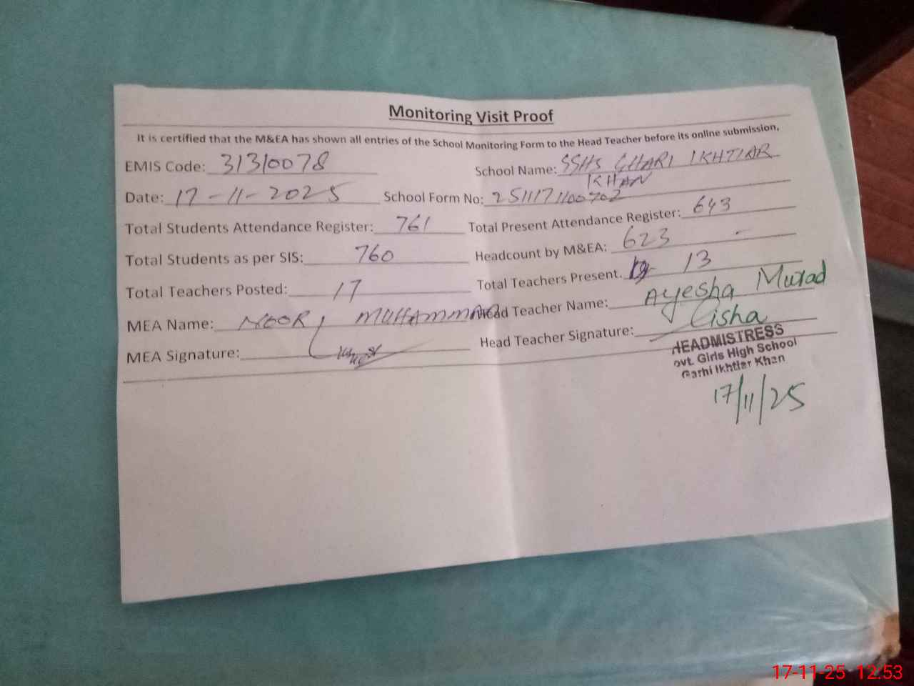 | Attendance Register | Head Teacher | MEA with School | Visit Proof |