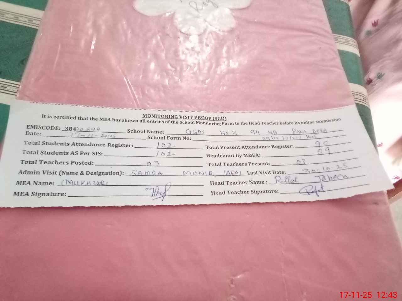 | EMIS Code: 38420694 | Name of School: GGPS NO.2 CHAK NO.94 NB PAKKA DERA | |||
