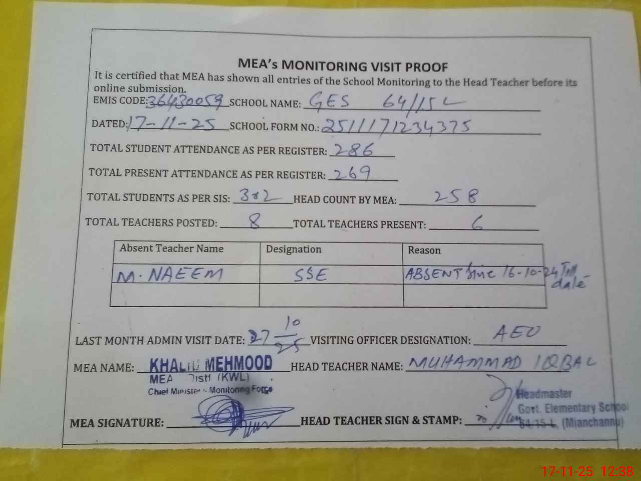 | EMIS Code: 36430059 | Name of School: GES 64/15-L MIAN CHANNU | |||