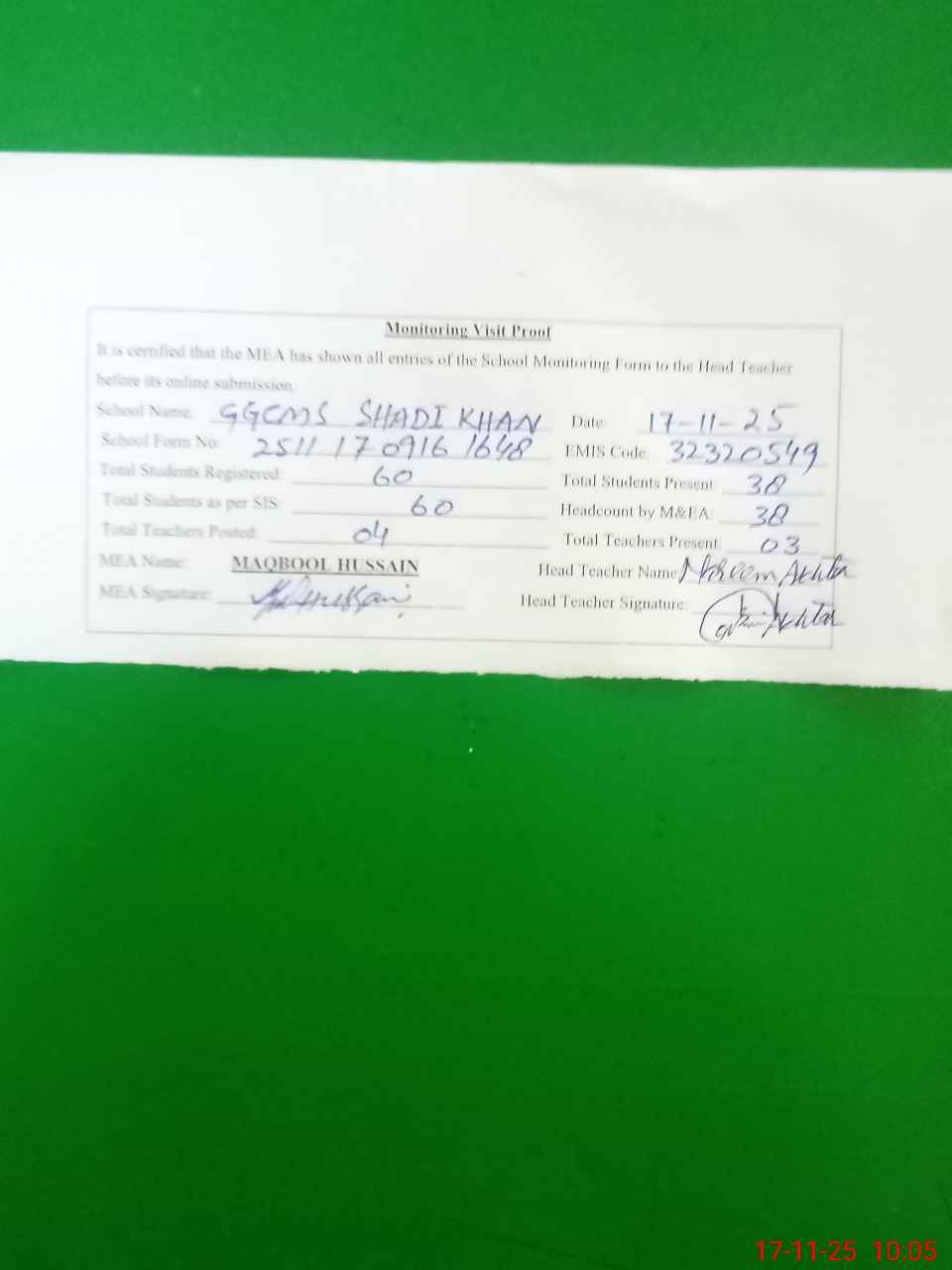 | EMIS Code: 32320549 | Name of School: GGCMS SHADI KHAN | |||