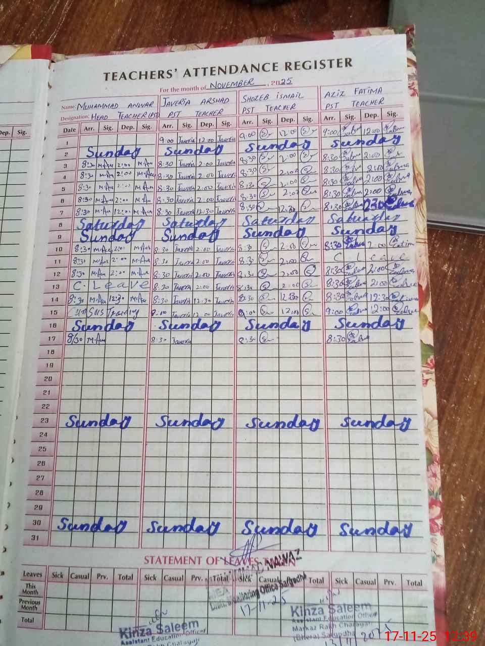| CNIC | Full Name | Designation | R/C | Absence During Last Calender Month |