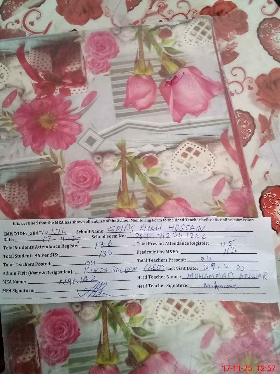 | Attendance Register | Head Teacher | MEA with School | Visit Proof |