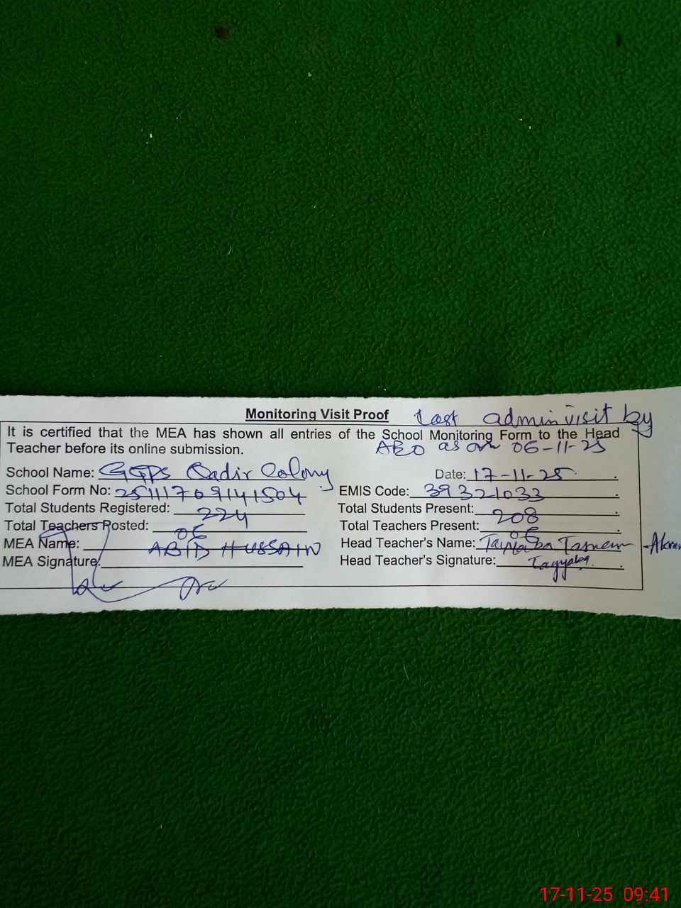 | EMIS Code: 39321033 | Name of School: GGPS QADIR COLONY | |||
