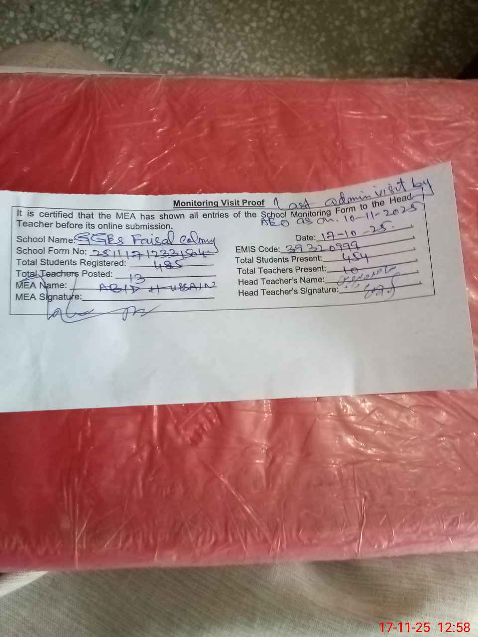 | EMIS Code: 39320999 | Name of School: GGES FAISAL COLONY OKARA | |||
