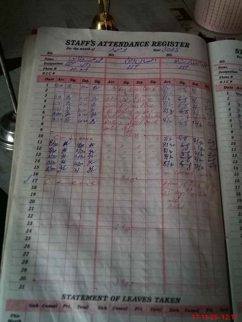 | CNIC | Full Name | Designation | R/C | Absence During Last Calender Month |