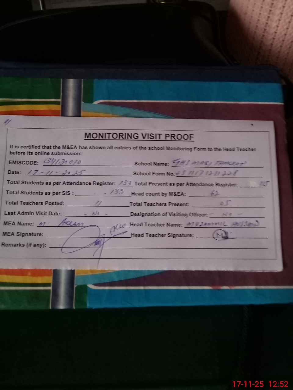 | Attendance Register | Head Teacher | MEA with School | Visit Proof |