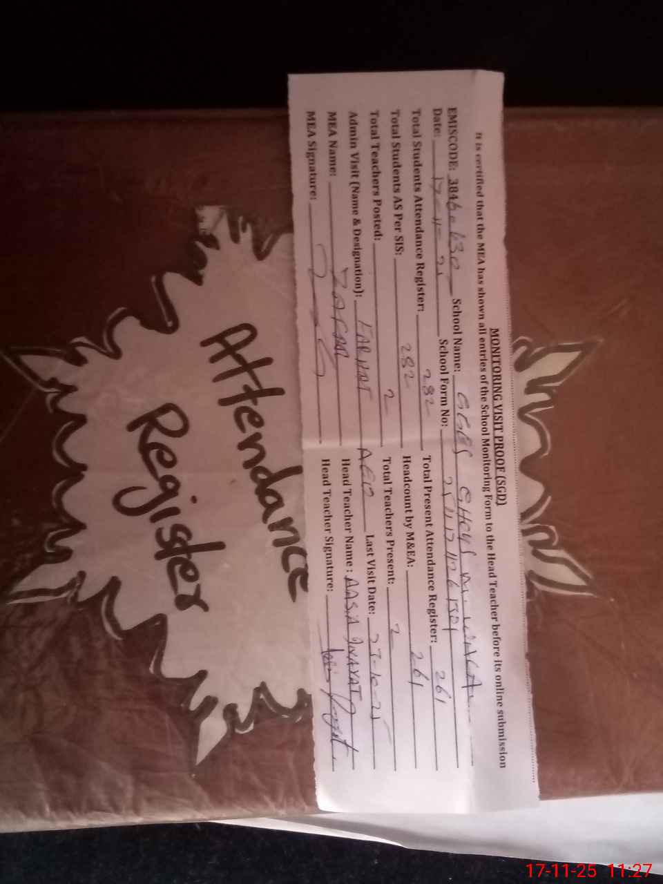 | Attendance Register | Head Teacher | MEA with School | Visit Proof |