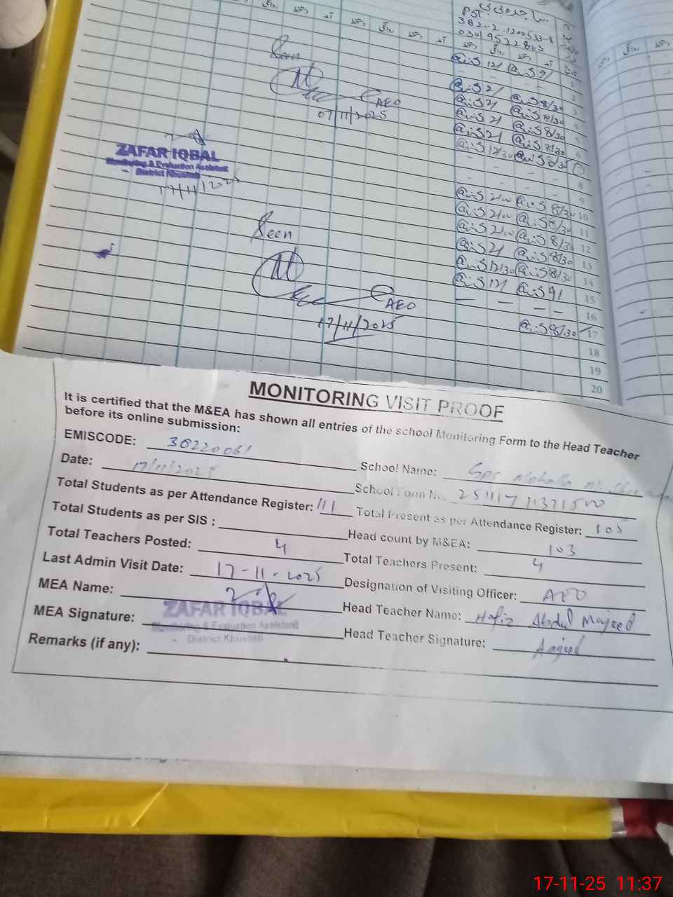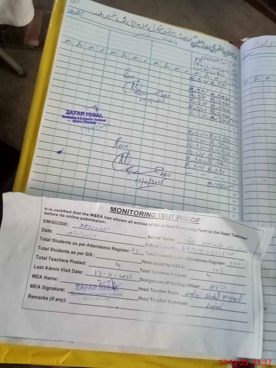 | Attendance Register | Head Teacher | MEA with School | Visit Proof |
