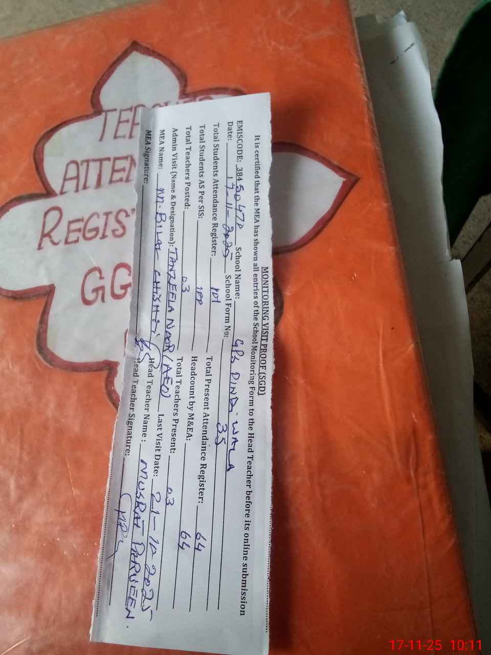 | Attendance Register | Head Teacher | MEA with School | Visit Proof |