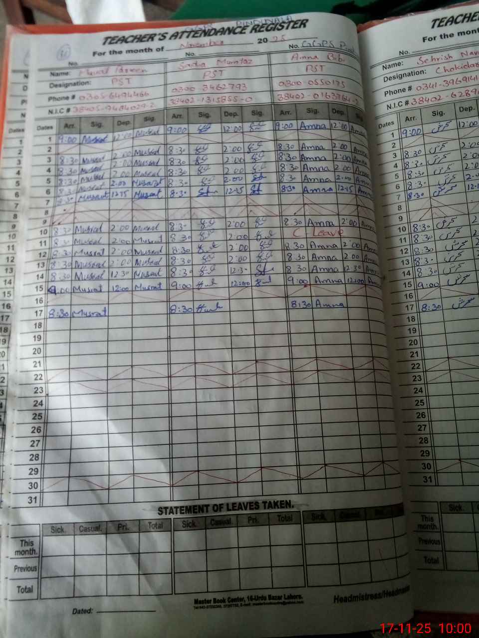 | CNIC | Full Name | Designation | R/C | Absence During Last Calender Month |