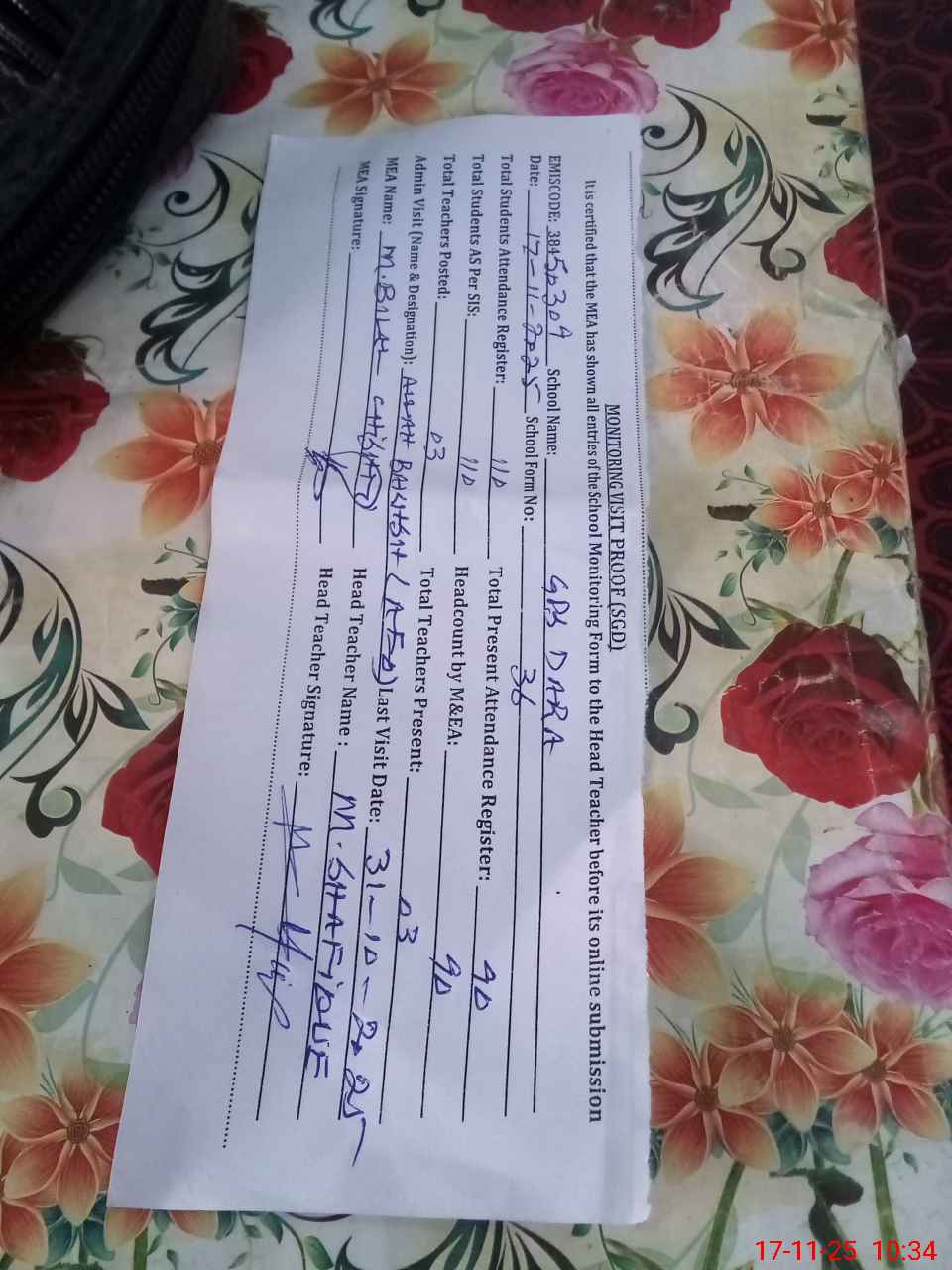 | Attendance Register | Head Teacher | MEA with School | Visit Proof |