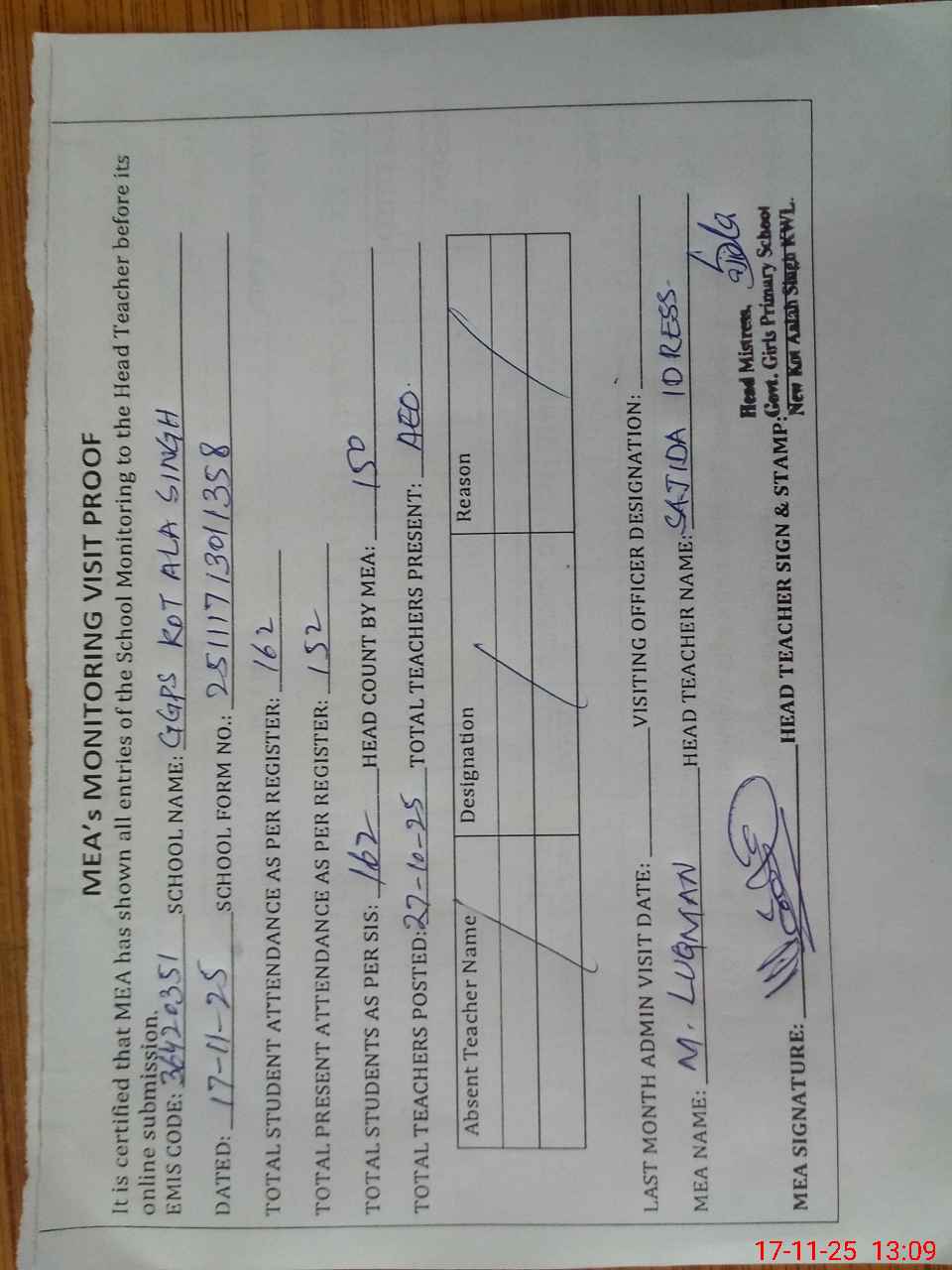 | EMIS Code: 36420351 | Name of School: GGPS KOT ALA SINGH, KHANEWAL | |||