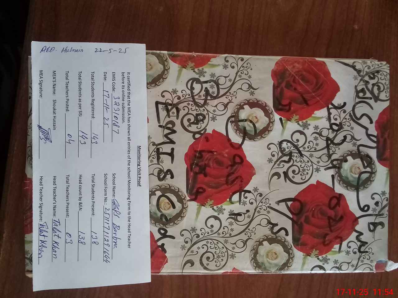 | Attendance Register | Head Teacher | MEA with School | Visit Proof |