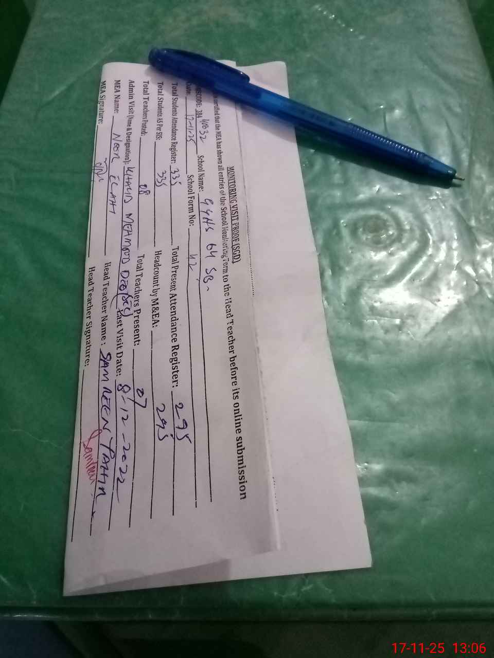 | Attendance Register | Head Teacher | MEA with School | Visit Proof |