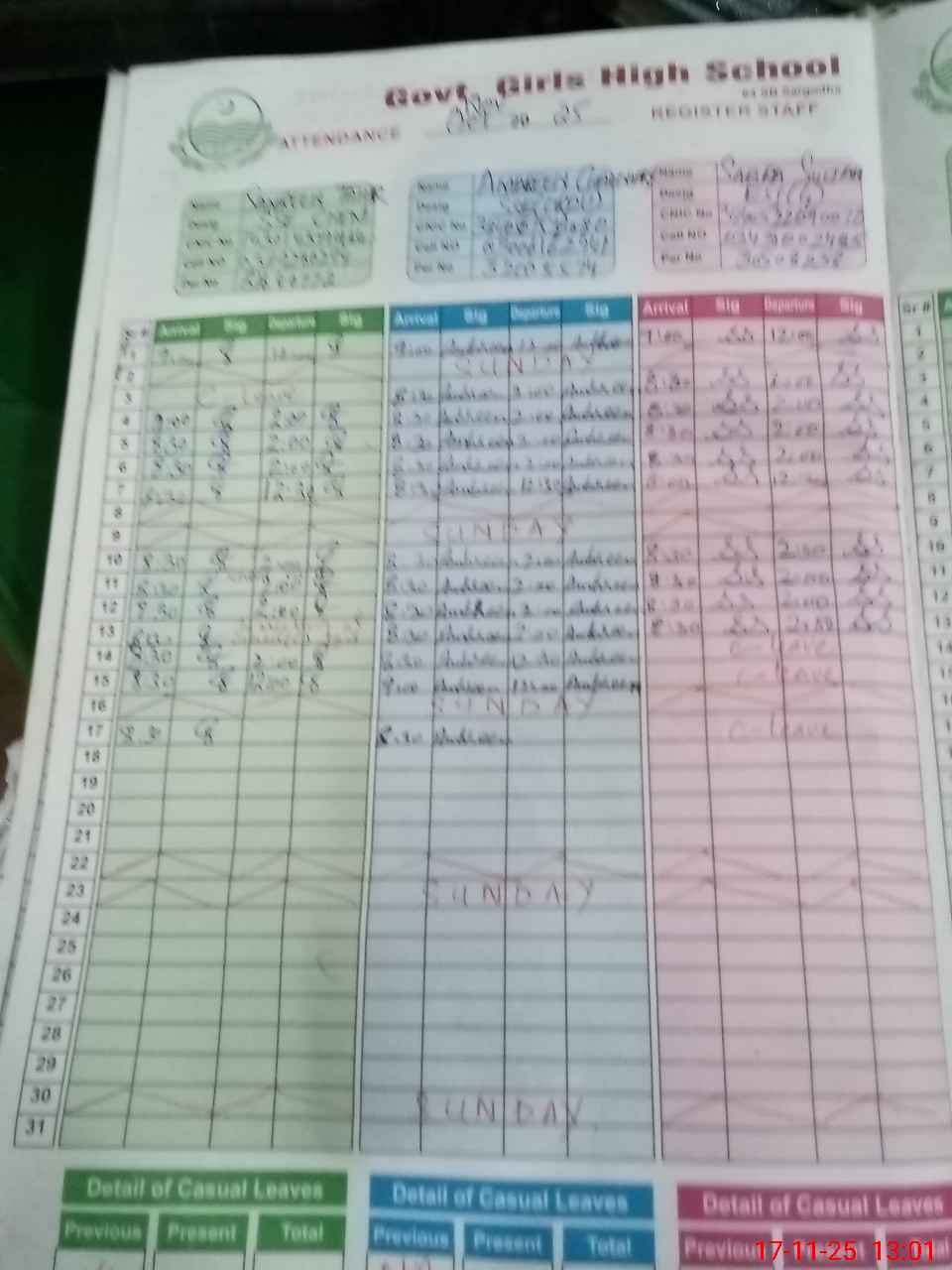 | CNIC | Full Name | Designation | R/C | Absence During Last Calender Month |
