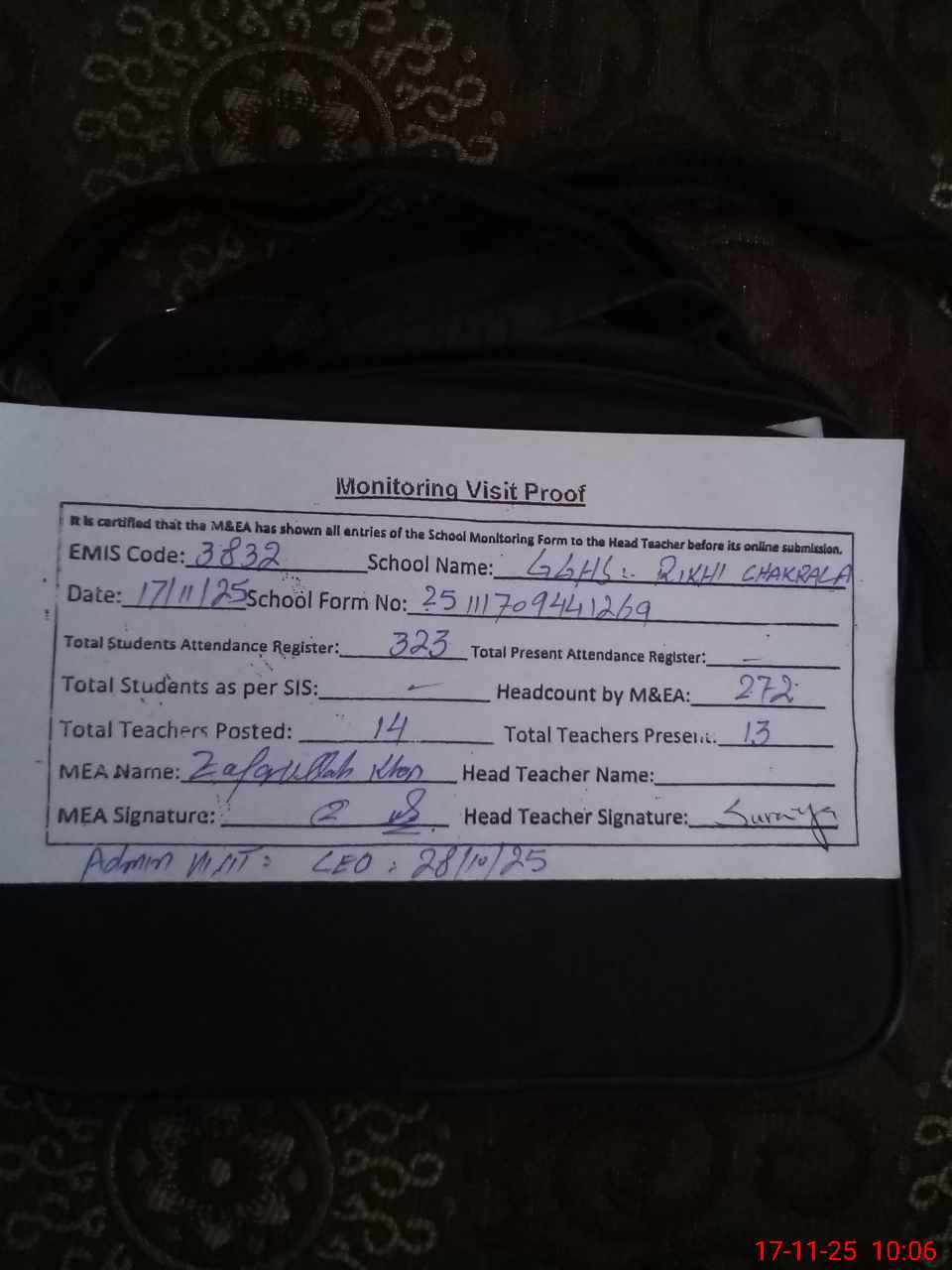 | Monitoring Date: 17-11-2025 | Start Time: 17-11-2025 09:19 AM | End Time: 17-11-2025 10:06 AM | Name of MEA: ZA**** UL**** KH**** | |