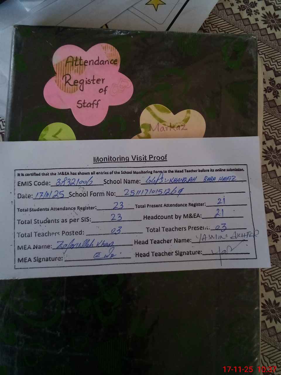 | Attendance Register | Head Teacher | MEA with School | Visit Proof |